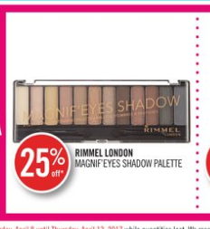 go. I bought it to carry with me to apply if I get shiny throughout the day. I’ve only used it a couple times but I like it so far. It was actually on sale at Shoppers. I noticed in the flyer that another Rimmel product was on sale. The Rimmel London Magnif’ Eyes Shadow Palette is 25% off. It looks like a pretty colour palette and if you’re wanting to try a new palette, getting it on sale is key. I haven’t tried this palette so I can’t speak to the colour payoff or quality, but at 25% off it may be worth the price to try it out.